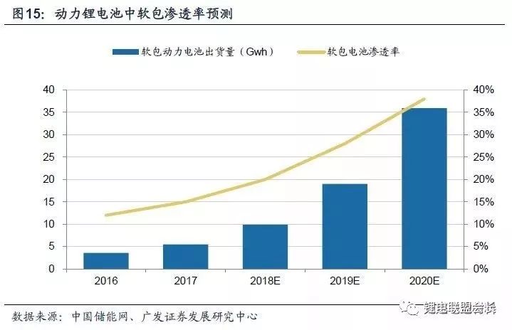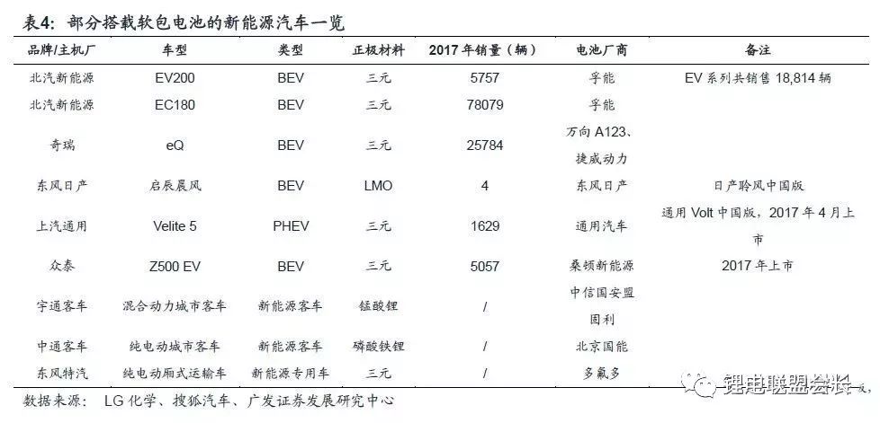国内市场,软包电池进入部分新能源乘用车、客车、专用车龙头企业供应链,应用前景持续看好。北汽新能源、奇瑞等厂商在其畅销车型中引入软包,东风日产、上汽通用等企业积极推进国外软包车型本土化。软包电池也应用于新能源客车和专用车,宇通客车、中通客车、东风特汽等龙头企业均有车型搭载软包电池。