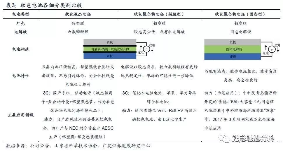 按照电解液物质状态的不同,软包电池可分为软包液态电池和软包聚合物电池,前者使用液态电解液,后者使用的电解液目前以胶体为主。以固态物质为电解液的全固态电池仍处于研发示范阶段,将进一步提升动力电池的能量密度和安全性,由于不使用液态电解液,电池封装可使用软包。软包液态电池广泛应用于国产手机、充电宝,著名畅销车型日产聆风即装载了AESC提供的层叠式软包液态电池;软包聚合物电池则用于笔记本电脑及品牌手机。