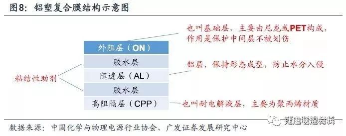 铝塑膜的材料属性对于保障电池长周期稳定运行十分关键,是软包电池与圆柱型、方型硬壳电池主要区别所在。铝塑膜的设计、制造被认为是锂电行业三大技术难题之一。铝塑膜一般由外阻层(尼龙)、铝层和高阻隔层(聚丙烯)组成,在两层之间夹有胶水层。按照功能用途,铝塑膜可以分为动力用和非动力用两类。前者所使用的铝塑膜厚度为152μm,后者一般使用88-123μm厚度的铝塑膜。相对而言,前者的技术要求更高。