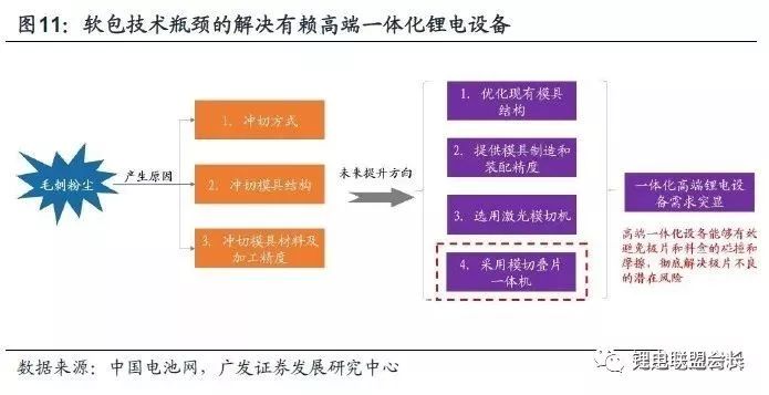 但这只能表明承担国家专项的三家企业对三元软包技术路线高能量密度特征的认可,实际扩产情况仍然是企业从自身出发,寻求技术与效率的均衡点。而软包电池目前尚未对方形电池和圆柱电池形成压倒性优势的主要短板有两方面:一是成本问题:铝塑膜这一核心部件目前国产化程度较低,主要依赖于国外进口,成本较高。二是工艺难度:软包电芯通常采用叠片工艺而非卷绕方式,在叠片模切过程当中,传统五金模切机往往造成冲切断面出现毛刺、易掉粉问题,导致极片质量不好,严重影响成品电池安全性能,同时残留的粉尘在复杂的使用环境下,容易造成电池内部短路,轻则缩短电池寿命,重则导致电池出现安全问题。