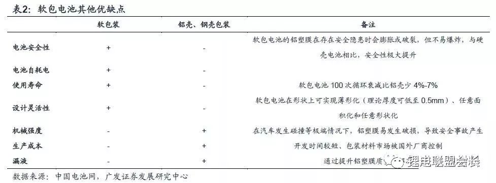 成本和一致性问题成软包电池发展限制因素。软包电池不足之处在于,目前生产工艺尚不成熟、标准化程度较低、电池一致性较差。不过这些劣势未来 通过生产规模化、自动化、增强电池管理系统、铝塑膜质量提升来消除。此外,软包原材料铝塑膜仍有赖进口,动力电池制造厂商对国产铝塑膜接受程度低,这也在一定程度上限制了软包电池的大规模发展。未来随国内企业在铝塑膜领域的产能发力,后续限制性因素有望陆续化解。