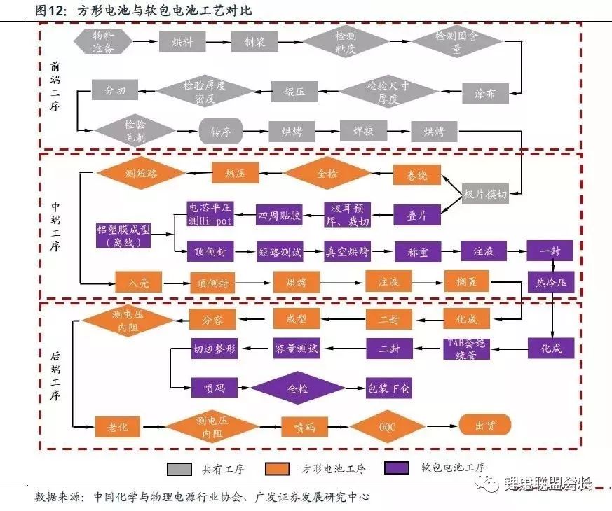 软包电池与方形电池的工艺在生产前端的搅拌、涂布、辊压等环节基本一致,工艺差异主要集中在动力电池生产的中端与后端。核心差异在于两方面:1)软包电池电芯采用叠片工艺,而方形电池通常采用卷绕工艺;2)铝塑膜作为软包电池包装材料,其中后端的注液、封装均与方形电池存在较大差异。