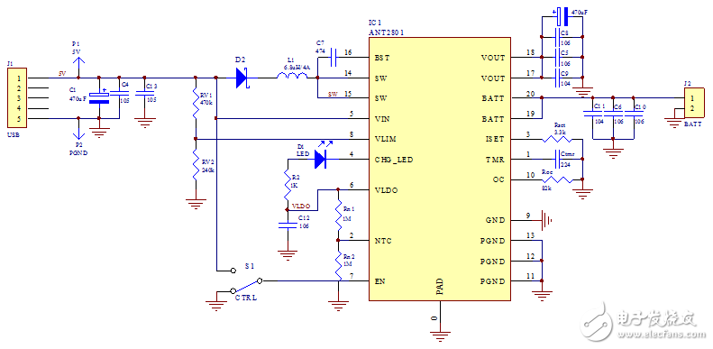 ANT2801内部充电管理部分采用一套完整可靠的充电机制。无论电池是否连接,都可以正常工作。而且无需外部补偿来实现芯片的稳定。在上电过程中,首先,VIN对VOUT充电,当达到VIN时,SW开始震荡工作,实现升压功能,当VOUT建立好之后,才开始检测VBATT状态。