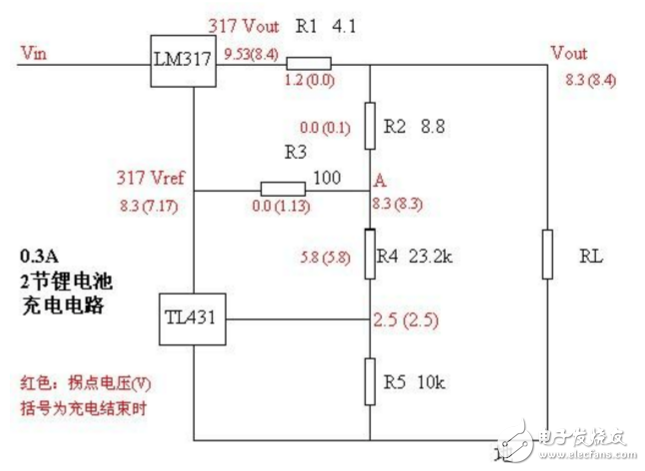 由LM317和R1、R2、R3组成一个典型的恒流电路(431暂时认为断开R4比较大可以先不看)。当电压不太高时保持恒定的充电电流。以两节电池充电为例,理想状态下,充电电流应该是电压达到8.3V前一直保持恒定。当A点电压达到拐点值8.3V时,经过R4、R5分压,TL431开始导通,并把LM317的基准点电压从8.3V逐渐拉下。所谓拐点就是指电流开始下降的那点。直到电压达到8.4V的0电流点,A点仍然保持这个8.3V电压,LM317的输出Vout下降到8.4V,其调整端下降到7.17V。