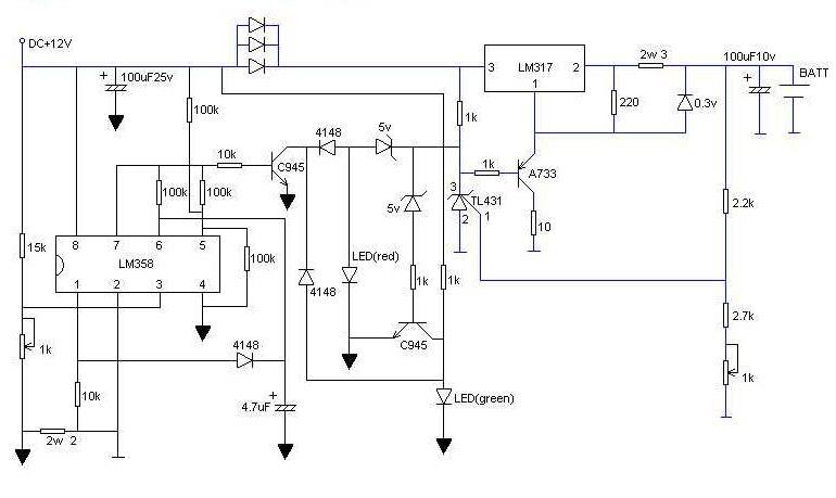 本电路显示充电状态,红灯闪正在充,绿灯闪马上要充满,绿灯亮完全充满。只要您有12V的电源就可以,接完电路后先别装电池,调右下角的可调电阻,使电池输出端为4.2V,再调左下角的可调电阻使LM358第三脚为0.16V就可以了,充电电流为380mA,超快,三个并连的二极管是降压的,防止LM317过热,且LM317须加散热片,图中的三极管可以任意型号。
