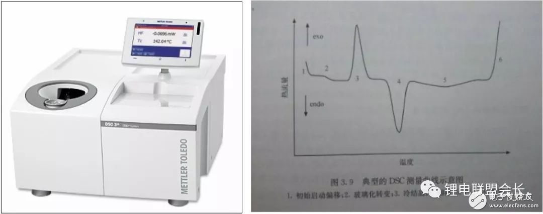 2)差示扫描量热法(differenTIal scanning calorimetry,DSC),一种热分析法:在程序控制温度下,测量输入到试样和参比物的功率差温度的关系。差示扫描量热仪记录到的曲线称DSC曲线,它以样品吸热或放热的速率,即热流率dH/dt(单位毫焦/秒)为纵坐标,以温度T或时间t为横坐标,可以测定多种热力学和动力学参数,例如比热容、反应热、转变热、相图、反应速率、结晶速率、高聚物结晶度、样品纯度等。
