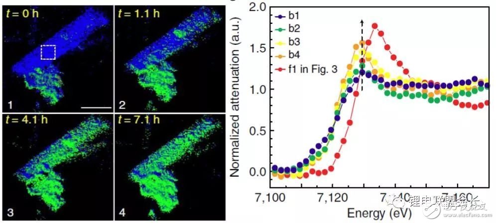 原位X射线荧光谱技术可以得到较轻元素的分布情况及价态信息。原位X射线显微技术可以对电极材料进行无损显微成像,并同时得到特定元素的分布及价态信息。优势在于它们在进行成像的同时,能够采集到微区的谱学信号(Nat. Commun., 6, 6883 (2015))。
