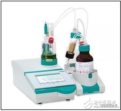 从上图中可以看出,通过对不同元素面分布进行分析,可以看出元素的分布状况,这对于材料的制备来说具有很强的指导意义。除此以外,还有XRF(X射线荧光光谱仪),EDX(指的是能量散射型X射线荧光光谱仪,也有人叫EDXRF),所分析的结果也是大同小异,在此不再赘述。2.水分测试:材料中的含水量也是电池制造企业所关注的一个重要指标,关乎着烘干时间的长短以及相关参数的设置,现在普遍都用卡尔费休法进行测试。其原理是仪器的电解池中的卡氏试剂达到平衡时注入含水的样品,水参与碘、二氧化硫的氧化还原反应,在吡啶和甲醇存在的情况下,生成氢碘酸吡啶和甲基硫酸吡啶,消耗了的碘在阳极电解产生,从而使氧化还原反应不断进行,直至水分全部耗尽为止,依据法拉第电解定律,电解产生碘是同电解时耗用的电量成正比例关系的,其反应如下: