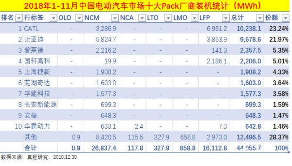 真锂研究的统计数据显示,2018年1-11月中国电动汽车市场共实现锂离子电池装机44.1GWh,之前我们每月发布的都是电池芯(Cell)厂商的情况,这里我们来看看电池包(Pack)厂商的情况。