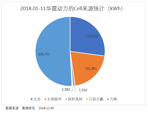 华霆动力作为第10大Pack厂商,所需Cell来自5家厂商:其中天津力神供应了327MWh的Cell,占比50.83%,是其最大的Cell供应商;比克排在第2供应了174MWh,占比27.13%;东莞振华供应了132MWh,占比20.53%;另有国轩高科和江苏天鹏有少量供应。