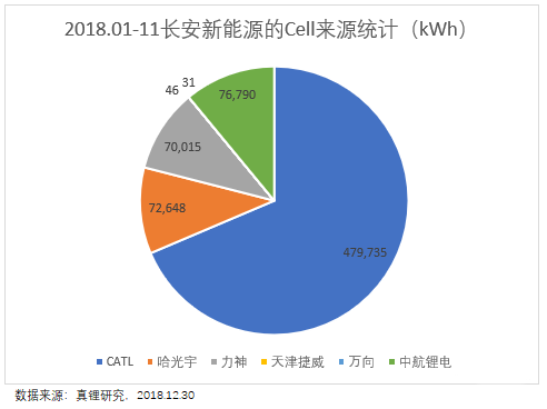 长安新能源作为前11个月的第8大Pack厂,所需Cell来源相对分散的同时也较为集中,具体见下图:长安新能源共有480MWh的Cell来自CATL,占比68.61%;来自天津力神、中航锂电和哈尔滨光宇的Cell量相差不大,均为70多MWh,占比也均在10%点多;捷威动力和万向开始打入长安新能源的市场,但目前供应量还非常少。