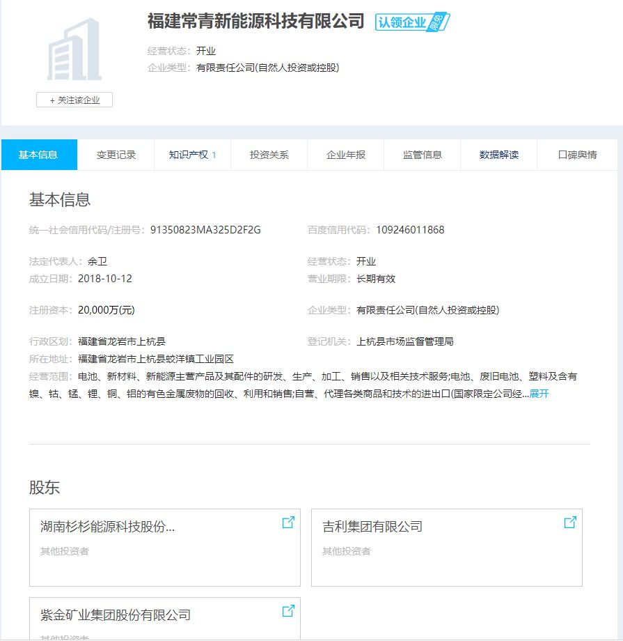 2018年10月,吉利集团与杉杉股份、紫金矿业出资组建了福建常青新能源科技有限公司(下称福建常青)。福建常青官方网站称,该公司是电池回收、前驱体制造为一体的合资企业。福建常青坐落于福建省龙岩市上杭县,注册资金2亿元。根据上杭县政府网站信息,该项目投资额达56亿元。